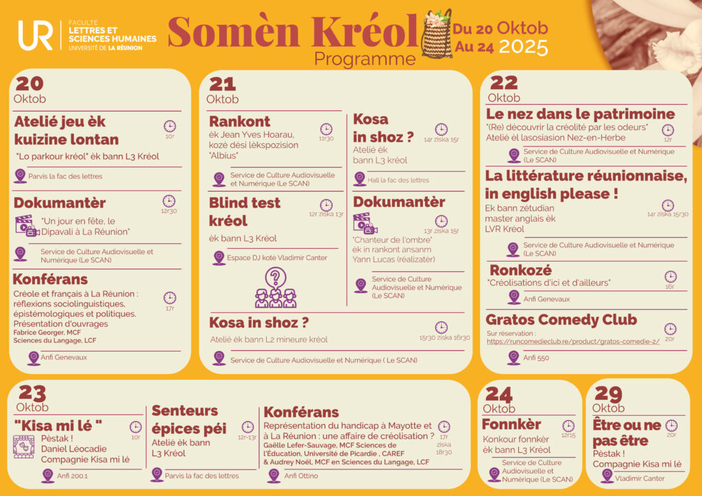 Le Département des études créoles, en partenariat avec le laboratoire LCF, invite le public à découvrir la langue et la culture créoles à travers une semaine de conférences, ateliers, projections de films, fonnkèr, théâtre et moments conviviaux. Les étudiants de L3, LVR et mineure créole seront au cœur de cette édition avec des animations originales telles qu’un atelier cuisine lontan, un blind test kréol, un konkour fonnkèr, ou encore des rencontres avec des artistes et chercheurs.