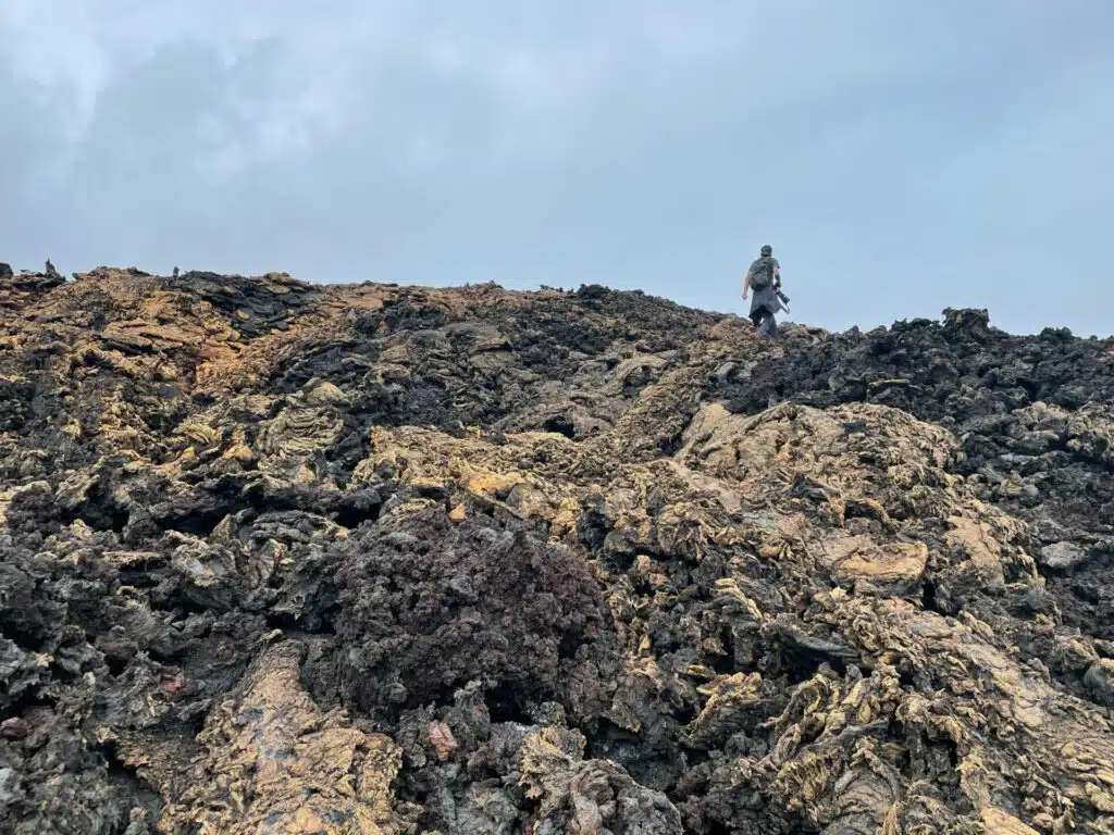 Au bout de trois quarts d’heure, nous vîmes nos voyageurs au fond de l’Enclos, qui commençaient à gravir la montagne. Le temps était très beau, presque calme. La surface sur laquelle ils marchaient, formée de laves refroidies, se répandait autour jusqu’au pied de l’Enclos ; il y avait, cependant, plusieurs de ces coulées de laves, mêlées de scories, qu’il fallait éviter.