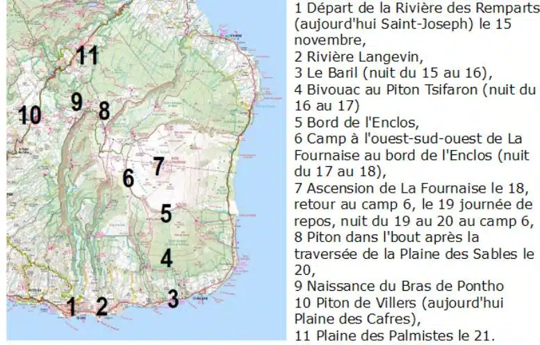 Les numéros dans le texte correspondent aux différentes étapes de l’expédition (carte suivante). Si Commerson parlait de 15 à 20 jours d’expédition, Lislet-Geoffroy ne parle que de 6 jours. Commerson évoque un déluge continuel de pluie, Lislet-Geoffroy est plus mesuré.
