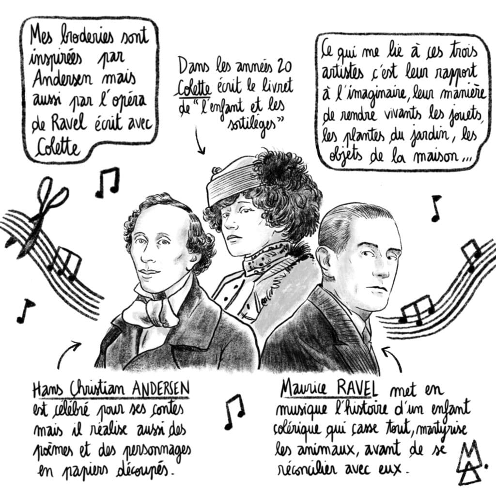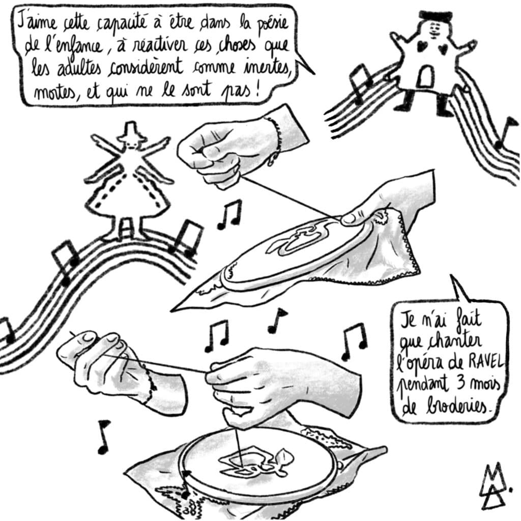 Les œuvres brodées de s’inspirent des contes, de l’opéra et de la poésie pour convoquer l’imaginaire de l’enfance, dans ses dimensions à la fois magiques et tragiques.