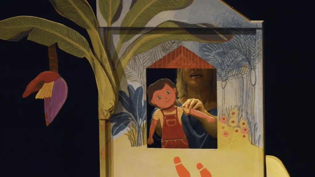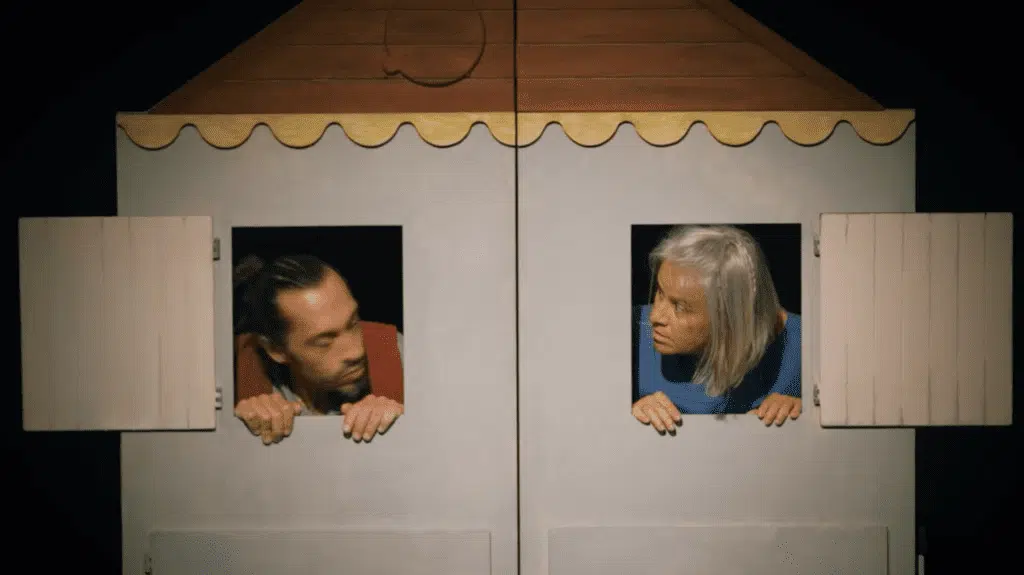 Sur scène, une guitare aux abords des coulisses mais, surtout, une petite maison en plein centre, un ti kaz lontan, comme les enfants savent en dessiner : un rectangle vertical pour l’habitation et un triangle en grenier, façon chapeau pointu. Deux carrés pour les volets qui s’ouvrent bientôt. Les deux comédiens apparaissent, les gradins sont silencieux : on s’apprête à découvrir la demeure de Sasha. Lors, les deux comparses utilisent des représentations d’animaux qui jouent, s’éveillent, se poursuivent : petite captation de l’attention de tous, mise en situation, on est à La Réunion, et, non, le chat ne mangera pas le margouillat. Ce théâtre d’objets que l’on retrouvera, avec des poissons ou des souliers qui volent et nagent, fait le délice des enfants. On revisite les acquis du langage avec un lexique adapté.