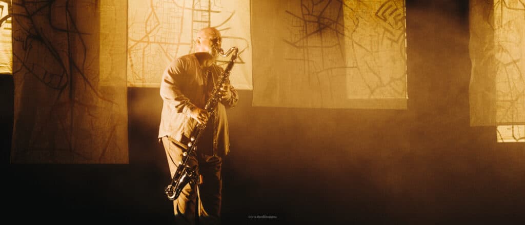 Avant même que Florient Jousse ne fasse son entrée en scène pour un récit de voyage exploratoire au cœur des Etats-Unis comme antre du jazz, avant même que le saxophone de Jah Pinpin ne vienne faire vibrer la salle en échos de scats, là, devant nous, sur le plateau, sept panneaux sont exposés, comme une tenture moderne et déjà une invitation à sortir des sentiers battus. Nyhama Betsaka signe une cartographie imaginaire : sur chaque tableau suspendu aux cintres s’entrecroisent des directions, se forment des carrefours, des traits appuyés, noirs sur fond de toile blanche écrue, comme autant de propositions de parcours ; comme un projet de vie en mouvement, avec des destinations non abouties, tantôt en courbe de contournements, tantôt en géométrie angulaire. Etrange. Superbe. Un embarquement au-delà du connu, au-delà des horizons, une porte ouverte sur l’aventure.