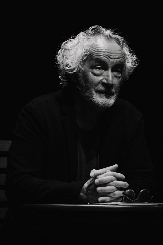 Il est bon vivant et déguste à sa table un verre de vin rouge. La qualité de la prestation scénique va crescendo. Tout se complexifie. Un poème en alexandrins est une ode à la Dive Bouteille. Puis il nous embarque sur des questions de grammaire : un descriptif de difficultés à reconnaître les temps et modes des verbes. En guide magistral, il nous amène à philosopher sur le doute : ainsi vote-t-on dans « l’Illusoire ». Et puis, « Y a-t-il une inflation au Laos ? » ou encore « Y a-t-il des ânes au Mali ? » L’oral dédouble la compréhension de l’écrit et nous décryptons avec lui de vrais rébus phonétiques. Nous adorons aussi : « Nul ne les a invités, pourtant les cons vivent ». Simple, fulgurant et très réjouissant.
