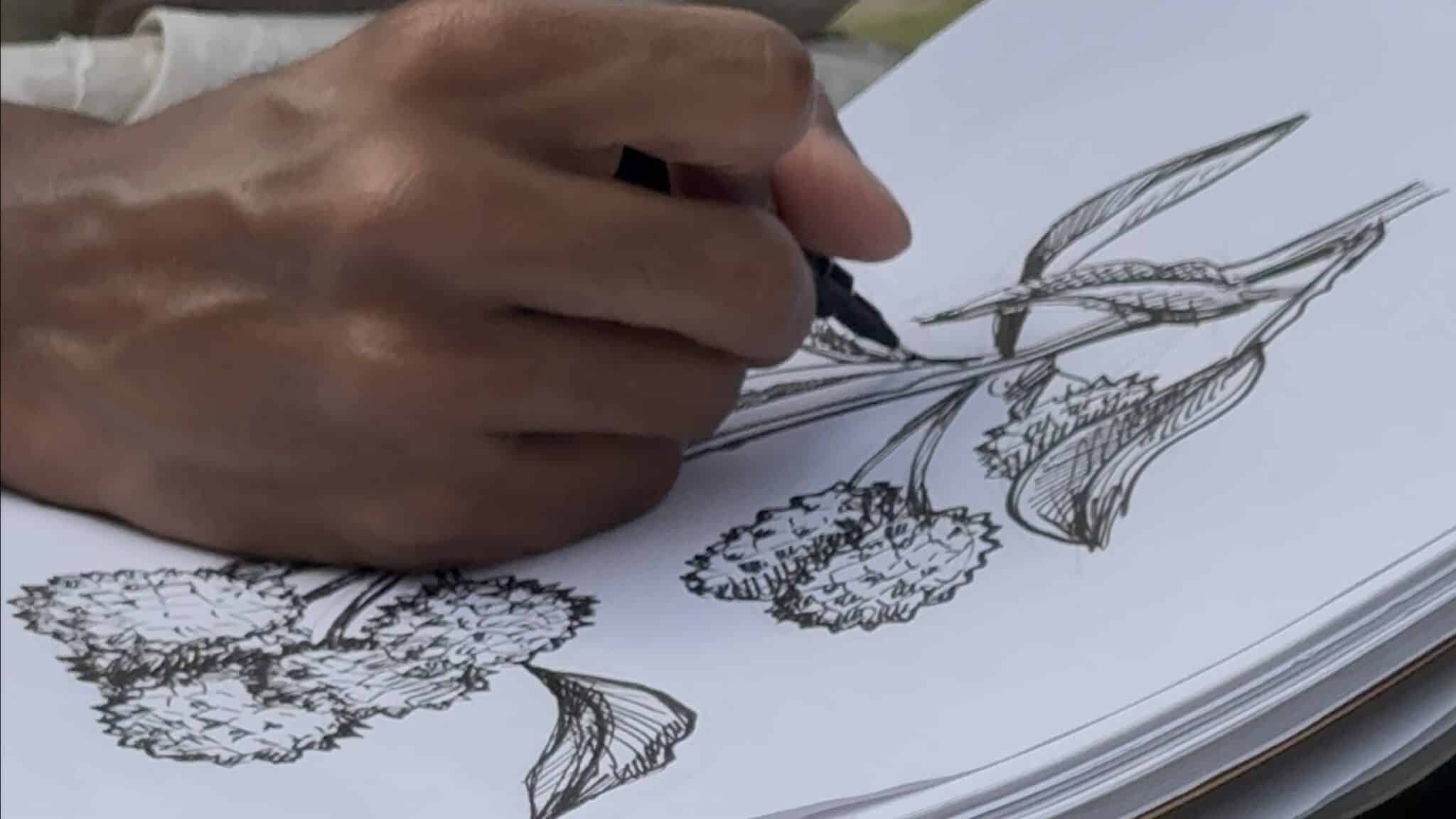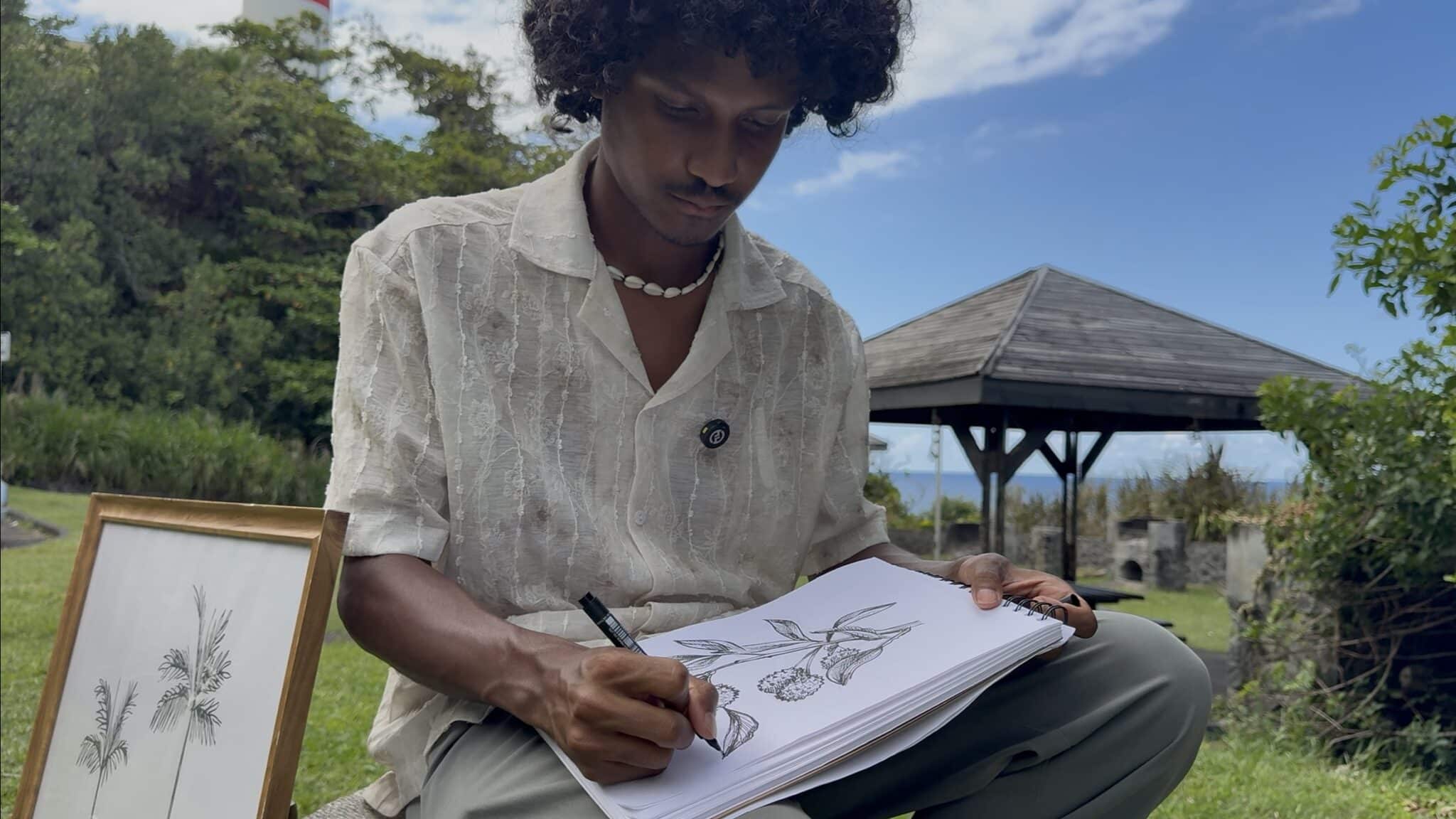 Quand il revient, c’est dans le jardin de ses parents qu’il trouve sa première inspiration : «c’est vraiment la cour créole mon inspiration. » Fruits, fleurs, petites scènes du quotidien : tout devient matière à dessins. Et même si ses créations lui prennent à peine 30–40 minutes, le plus dur reste l’idée : « Le plus long ça va être vraiment de trouver la thématique qui va rassembler les Réunionnais. ».