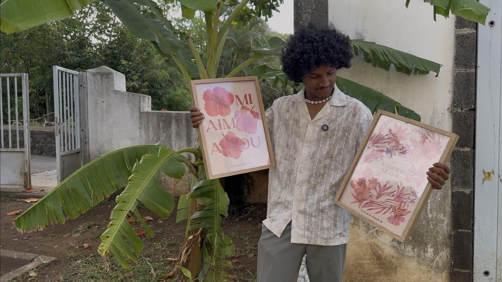 C’est là qu’il lance l’Atelier Frizé, un nom venu tout naturellement. « Mes cheveux frisés, c’était le point de départ » Un mot qui colle parfaitement à son style « avec plein de petites imperfections, pas lisse du tout.C’est frisé avec un Z. » L’Atelier Frizé, c’est aujourd’hui une manière simple et sincère de représenter l’île : « Le but c’est de représent’ nout péi d’une manière très simple, sans filtre. »