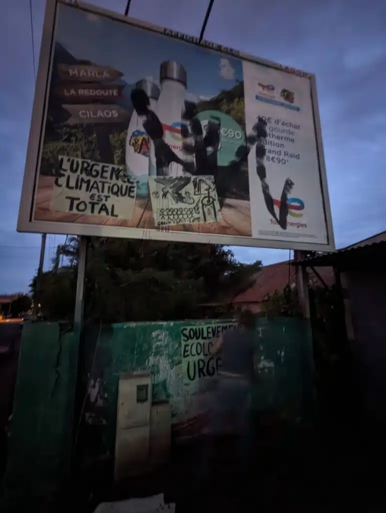« Alors que la loi Climat et résilience interdit la promotion des énergies fossiles, Total profite de son partenariat avec le Grand Raid et l’absence de décret d’application pour s’afficher en 4×3 dans toute l’Île. » (Le Tangue 16 octobre 2023)