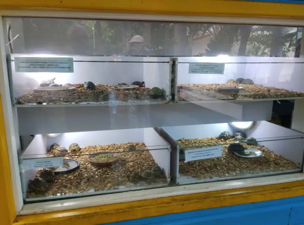 Au jardin, il y a même eu quelques spécimens qui avaient été saisis par les douanes. Monsieur Rivière raconte à c e propos l’anecdote suivante : « Une saisie avoisinait les 1000 tortues. On les a nettoyées, on les a soignées, on les a nourries, on les a pucées, et on les a ramenées sur Madagascar pour qu’elles retrouvent leur milieu naturel ».