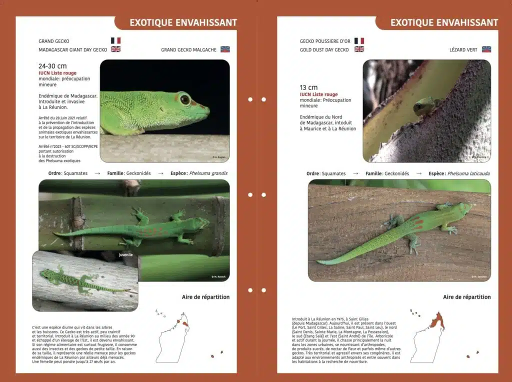 Par ailleurs, on trouve une quinzaine de reptiles exotiques dans l’île, dont six sont considérés comme envahissants et dangereux pour l’écosystème. Quatre espèces de margouillats, deux serpents, l’agame versicolore et le caméléon panthère, et plus récemment des phelsumas (lézards verts) et le célèbre agame des colons. Plusieurs sont des échappés d’élevages, le dernier est arrivé dans une cargaison de bois au Port.