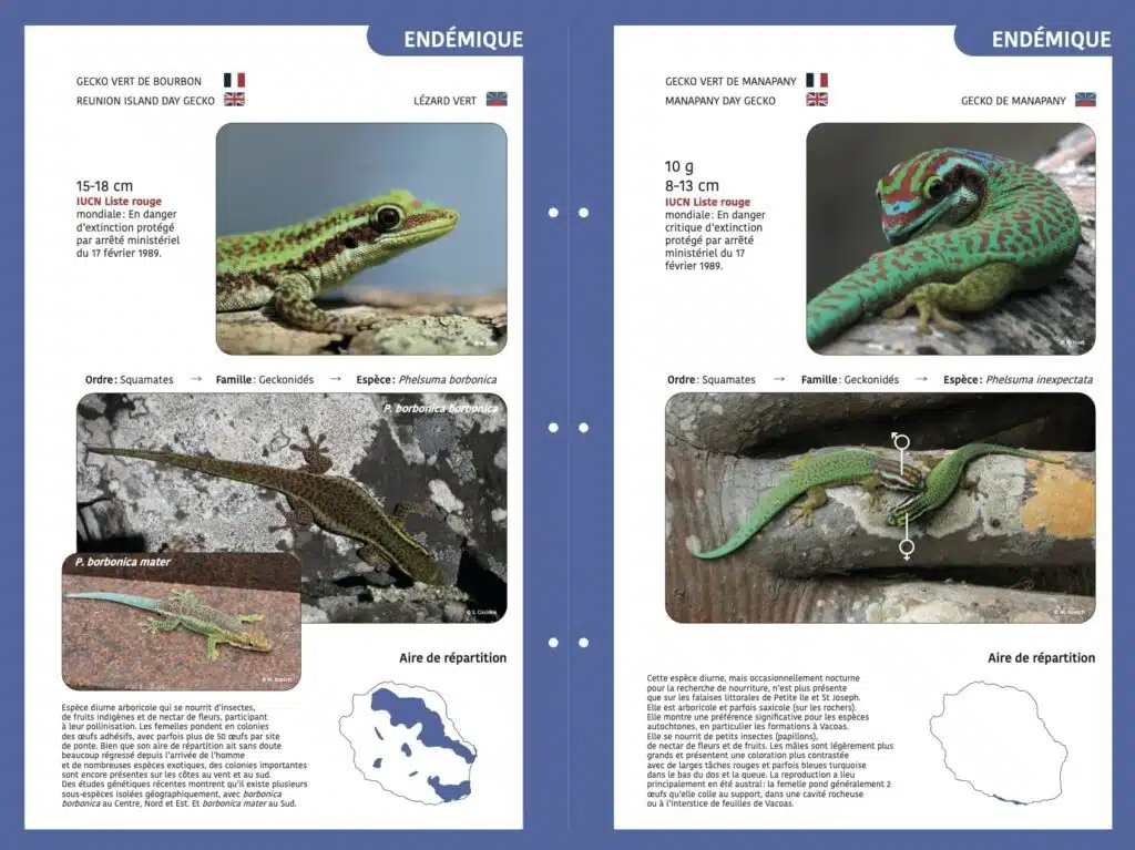 « L’Île de La Réunion a émergé il y a trois millions d’années, sans jamais avoir été reliée à aucune autre terre », indique Stéphane Ciccione, directeur de Kélonia et commissaire de l’exposition Reptiles. Des sept espèces endémiques à l’arrivée de l’homme, il n’en reste que deux en très grand danger d’extinction ; les autres ont aujourd’hui disparu. Les deux qui existent encore sont les lézards verts de Manapany (Phelsuma inexpectata), et de Bourbon (Phelsuma borbonicus). Les autres, toutes disparues, sont trois espèces de scinques (lézards diurnes de dix à quinze centimètres à 35 pour le grand scinque), une de gecko nocturne et la tortue géante.