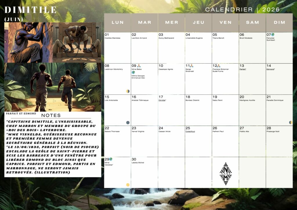 Dans ce calendrier, les saints catholiques qui peuplent les cases du lundi au dimanche sont remplacés par des personnalités réunionnaises telles que Sudel Fuma (historien), Serge Sinamalé (militant) , Françoise Guimbert (chanteuse de maloya), des figures du maronage comme Dimitile, Anchaing ou Héva ou des personnes esclavisées affranchies en 1848. On retrouve sur chaque mois, des mises en lumière d’évènements ou de personnages historiques comme le bagne d’enfants d’Ilet à Guillaume ou le couple de Louise et Juan jugés tous deux pour maronage au 18ème siècle.