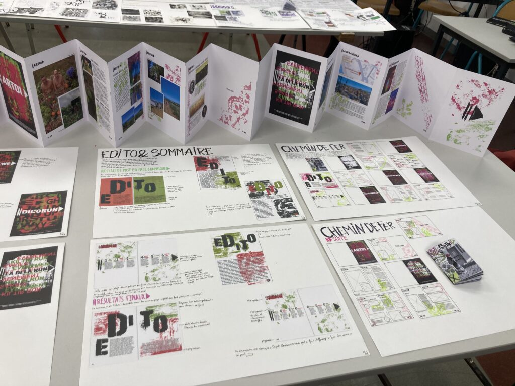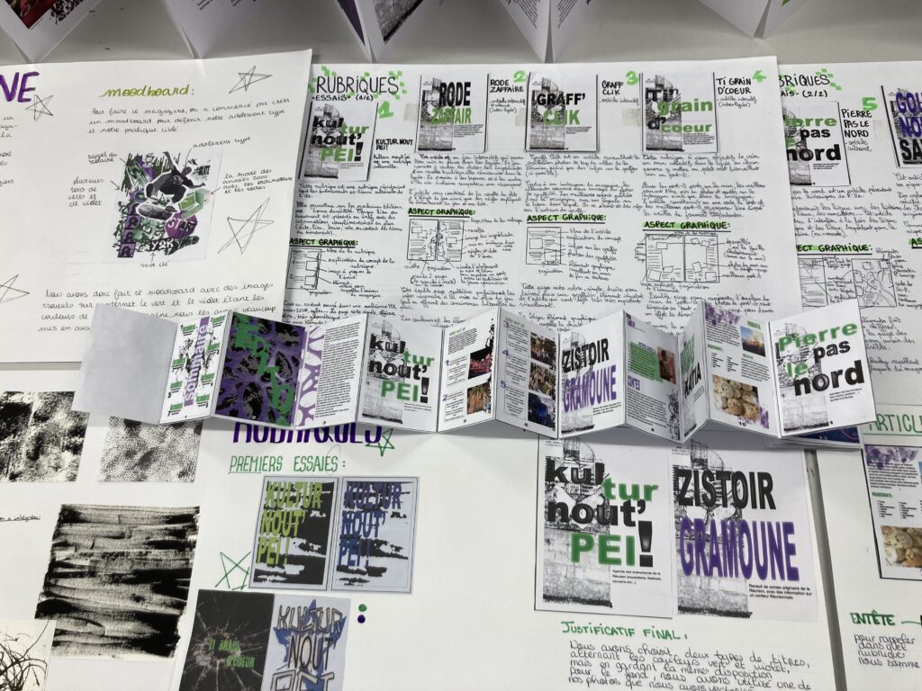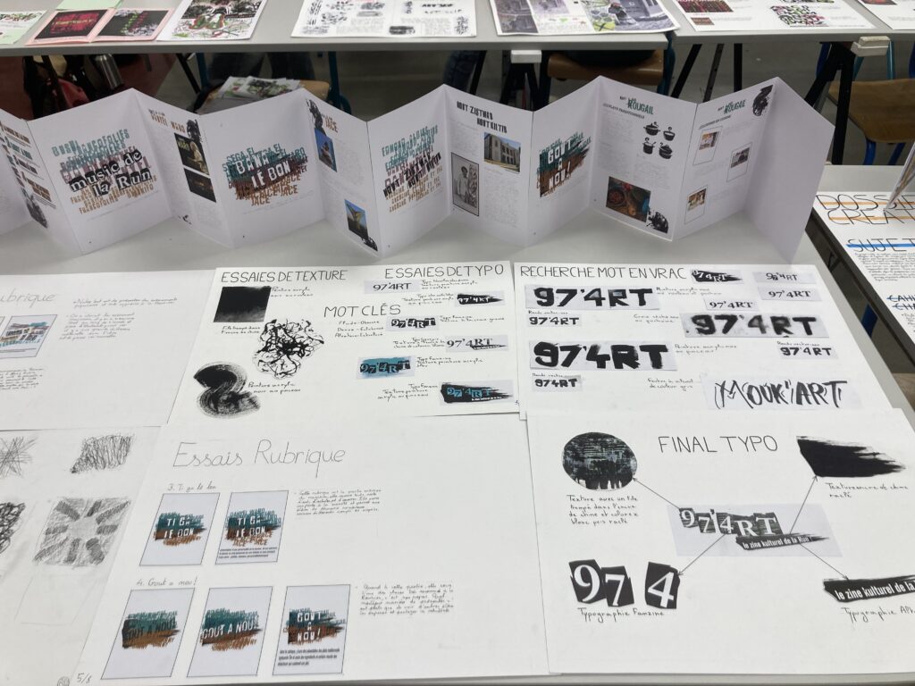 Ce projet qui a d’abord été élaboré par Parallèle Sud et la Direction des Affaires Culturelles (DAC) a très vite été piloté par Magdalie Malet-Cassante, professeure d’arts appliqués. Il fallait commencer de zéro et créer à la fois une typographie, un persona (public cible), des textures , prendre des photos et les modifier pour correspondre à l’esthétique choisie par le groupe d’élèves mais aussi travailler sur des rubriques qui puissent être réutilisées dans d’autres établissements.