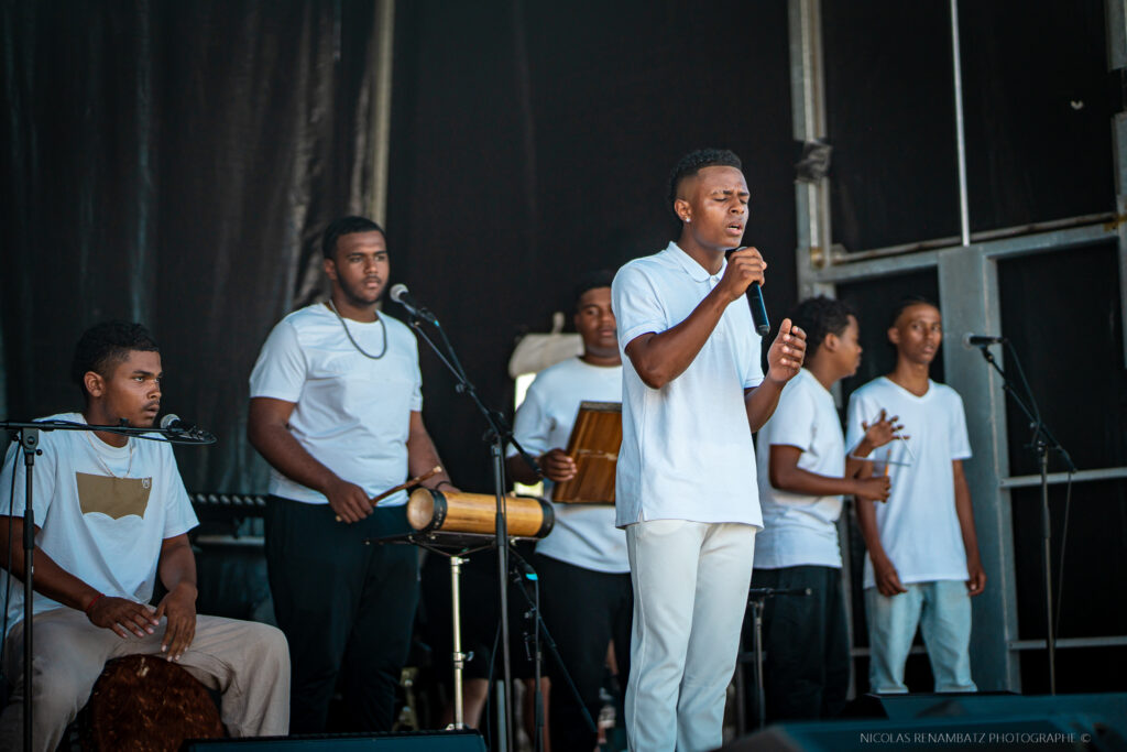 À 14h, Zanfan Gayar, vainqueur du Son du Bahut 2025, embrase la scène extérieure, transformant Bras-Fusil en kabar a ciel ouvert. La formation de jeunes maloyeur aux harmonies surprenantes, plusieurs fois récompensée déjà, font danser le public, les rythmes s’emparent des pieds, des hanches, du cœur. Le soleil tape juste ce qu’il faut, on en demandait pas moins : chapeau !