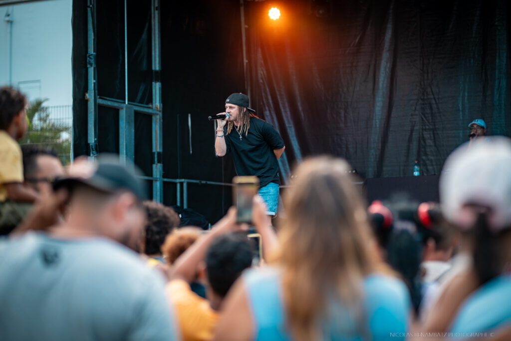 À 16h, la salle Gramoun Lélé se rassemble au village, les pas pressés, l’excitation palpable. Kent1 l’artiste révélation péi fait entrer l’amour dans l’espace. Les premières notes suffisent pour que le village entier chante : Mon Sang, Entre Nous… chaque titre déclenche une vague d’enthousiasme. Les mains s’élèvent, les pancartes lisent “Kent1 le meilleur” et les visages s’illuminent. Accompagné de DJ M’SY, les influences urbaines, zouk, séga se mélangent dans une fusion irrésistible, un zembrocal musical délicieux, pour un public comblé.