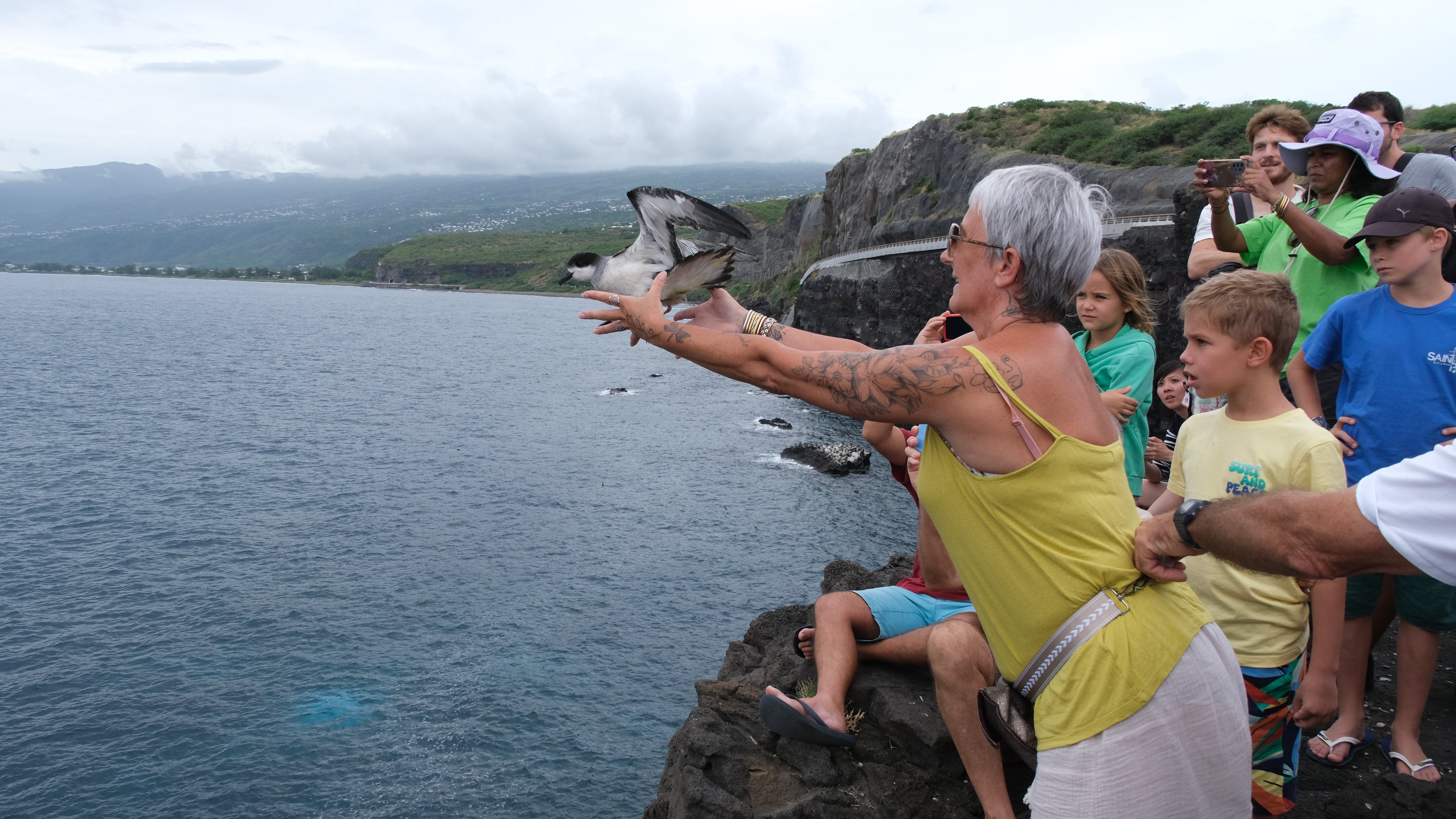 « Les parents de ces jeunes pétrels sont déjà repartis il y a un mois », indique Christian Léger, président de la Séor (Société d’études ornithologiques de La Réunion). Dans sa main, un oiseau marin prêt à prendre la mer, récupéré quelque part dans l’île à la suite d’une chute, perturbé par les lumières de la ville. Un petit lancer du bord de la falaise, l’oiseau plonge vers la mer avant de se redresser et de filer vers le large.