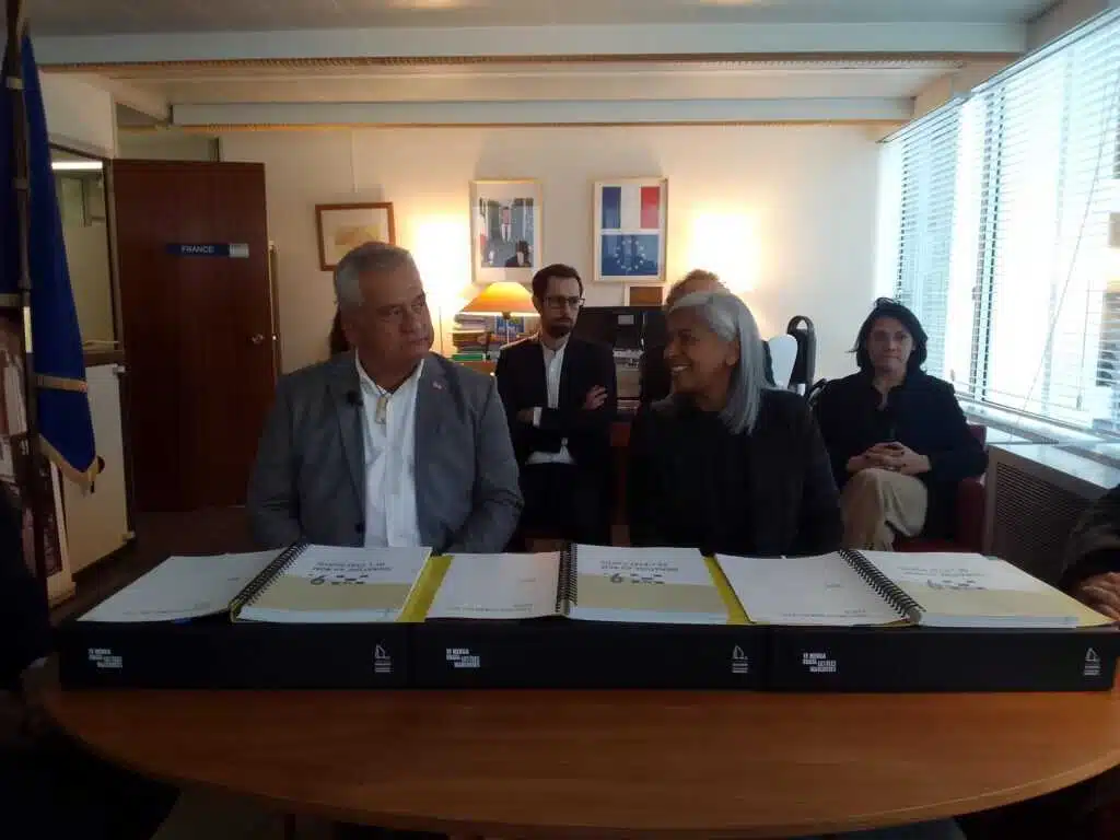 Il pèse pas moins de dix kilos, répartis en trois imposants tomes, on y trouve même des morceaux de tapa : le dossier de candidature des îles Marquises au patrimoine mondial de l’humanité est enfin arrivé au bout de son voyage. Entouré d’une délégation du gouvernement de Polynésie française, le ministre de la Culture Heremoana Maamaatuaiahutapu l’a transmis à l’ambassadrice de France à l’Unesco, Véronique Roger-Lacan.