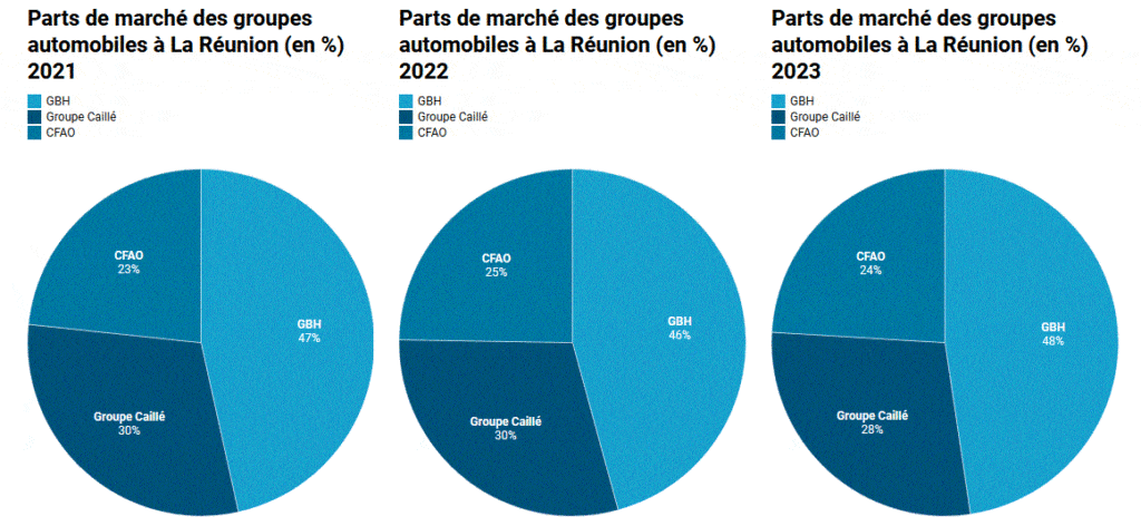 Sur l’île trois groupes se partagent plus de 90% du marché automobile. Le groupe Caillé (12 marques, dont Peugeot et 14 centres autos Midas), le groupe Hayot (15 marques, dont Renault, Dacia, Hyundai) et le groupe CFAO (Toyota, Citroën,…) ont un quasi-monopole des ventes. Le groupe Bernard Hayot à lui seul approche les 50% des ventes annuelles …