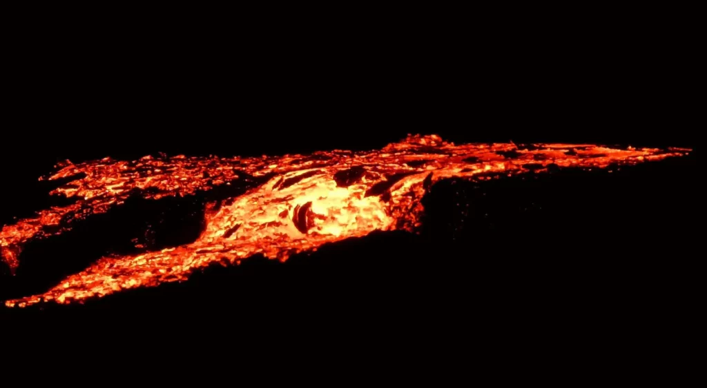 En bas, à 1,8 km de la route nationale, le front de coulée s’est figé. Mais en haut entre 1 500 m et 1 750 m d’altitude, les projections de succèdent et les coulées de lave s’étendent. Près de 6 millions de mètres cubes de magma se sont échappés des entrailles de la Fournaise.