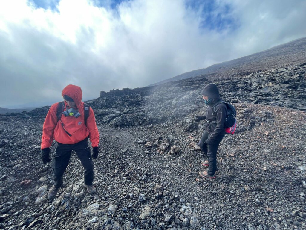 Ce lundi, avant le lever du soleil, le premier obstacle sur le chemin de l’éruption prend la forme d’un nuage de soufre. Les yeux piquent, la gorge gratte. Nous sommes prévenus par deux marcheurs, qui sont, eux aussi, de retour : le nuage est installé sur le plateau mais il se dissipe sur le versant qui mène à la faille éruptive. « C’est pénible mais ça passe », nous disent-ils.