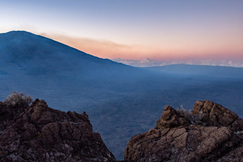 Les lueurs rougeâtres nous servent de point de mire. Le jour se lève alors que nous progressons péniblement dans une immensité de gratons. Ces scories présentent des formes, des couleurs et des consistances très variées selon la coulée dont elles sont issues. Les franchir exige de bonnes chaussures, un certain équilibre et une paire de gants car il faut souvent s’aider des mains et les contours sont tranchants.