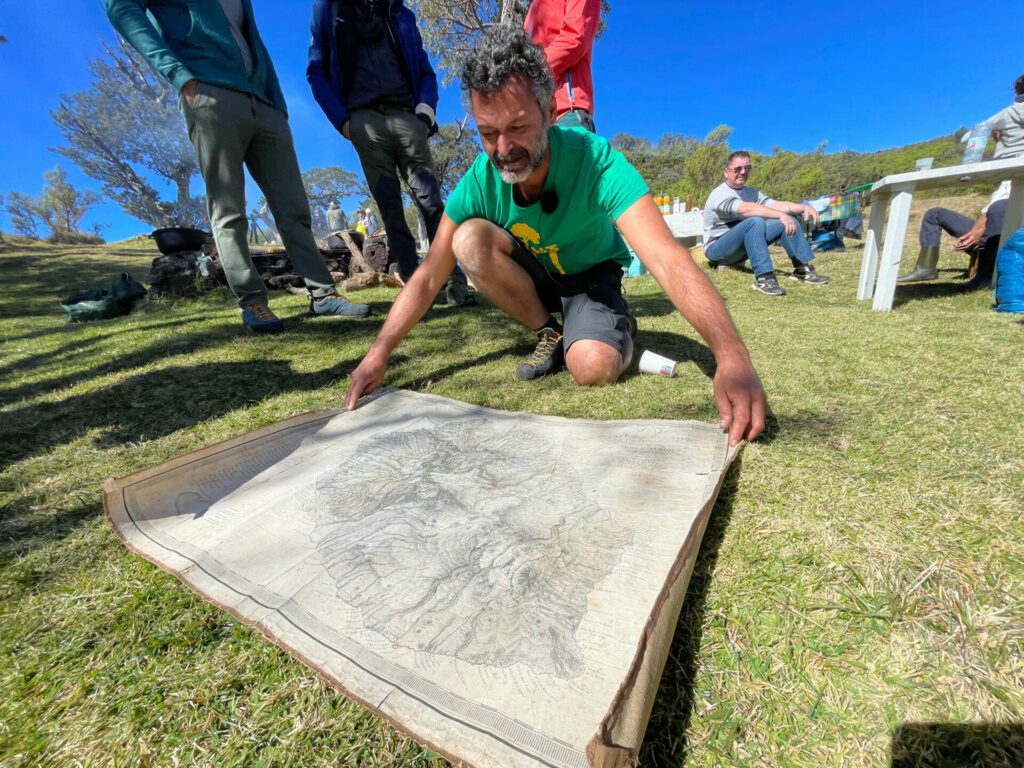 Le docteur Jean Perrin, également (re)découvreur de la caverne des Lataniers, a apporté une carte de La Réunion aux airs de parchemin. C’est la carte de Bory de Saint-Vincent dessinée en 1801 et imprimée en 1804. Les noms des lieux ouvrent des discussions passionnées.