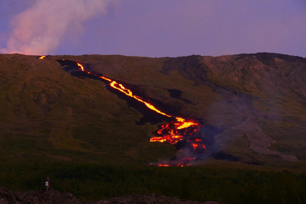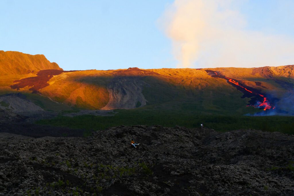 Pour couvrir l’événement, la petite équipe de Parallèle Sud s’est rendue sur le site, dans l’enclos, en décalage avec les habitués du volcan. En chemin nous avons d’abord croisé Alain Bertil, bien connu de tous les passionnés de magma, alors qu’il était sur le retour. Après l’extinction de la première faille, la deuxième, qui s’est ouverte dimanche en milieu de journée, était elle aussi sur le déclin. Et Alain entendait alors concentrer ses observations sur la troisième faille, à proximité du rempart du Tremblet. Il sortait donc de l’enclos quand nous y sommes entrés.