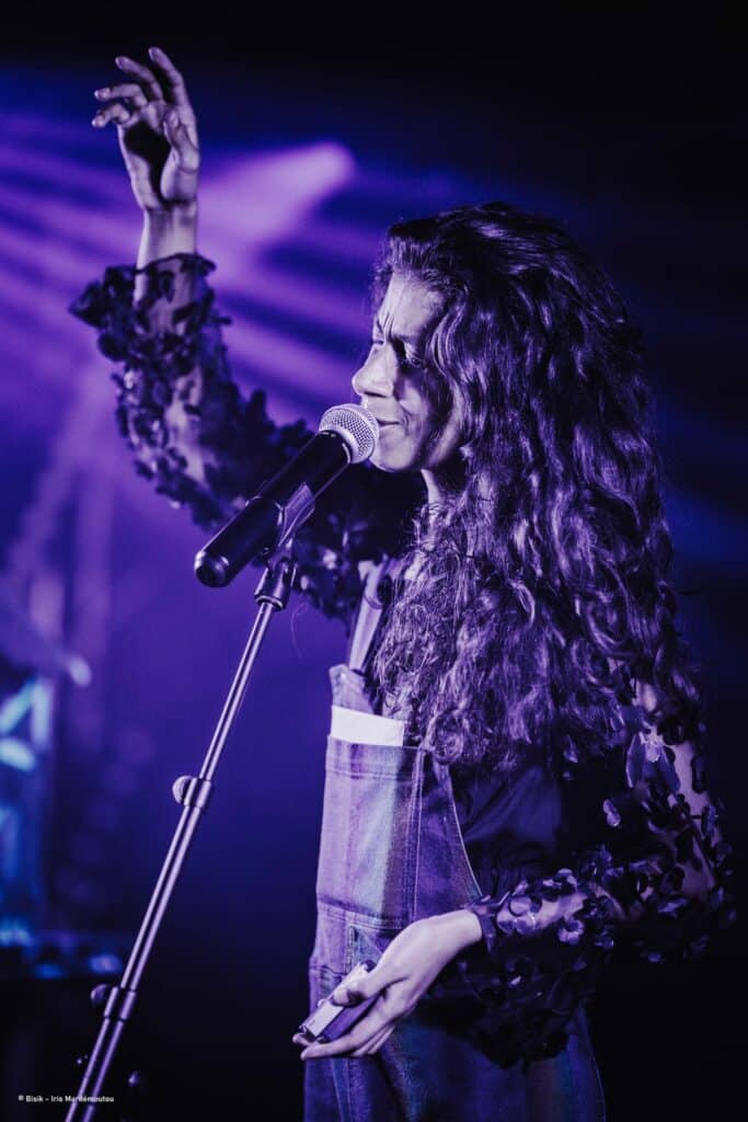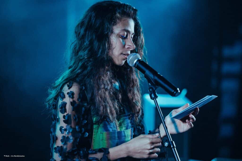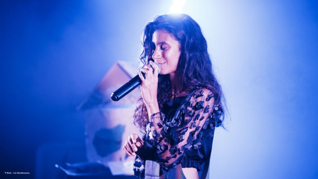 Dès son entrée sur scène, une lumière tamisée bleue, presque lunaire, enveloppe Lisa Ducasse. Seule, entourée de son décor minimaliste et poétique, la jeune artiste installe une atmosphère suspendue, faite de murmures, de silences habités et de mots choisis comme autant de pierres précieuses.